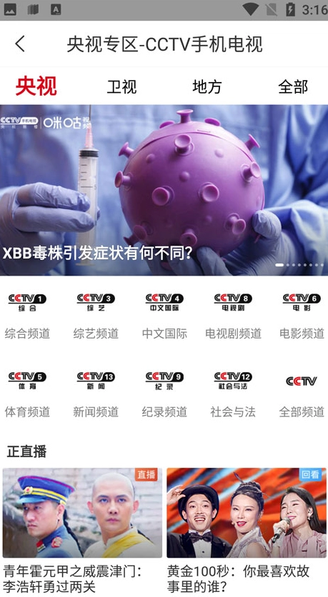 2、进去,可以看到央视、卫视、地方以及全部等专区