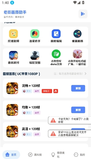 老街画质助手 2025,这是一款专门为香肠派对游戏精心打造的画质提升工具。当用户打开该软件,有两种方式来获取使用权限,一是输入卡密激活,二是通过完成任务免费解锁应用功能。完成这些步骤后,就能对香肠派对的国服、国际服进行画质调整啦。它不仅支持一键开启 120 帧,还能修改准星样式,操作十分简单,哪怕是新手小白也能轻松上手修改画质。喜爱这款工具的用户,赶紧来试试老街画质助手 2025 吧!