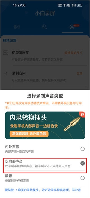 3、于录制声音的相关选项里,选中“仅内部声音”这一选项。