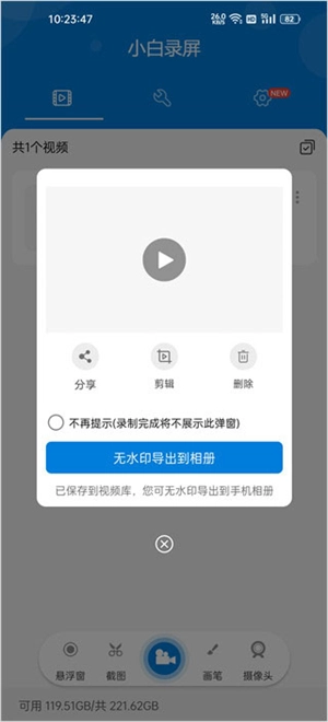 6、最终借助“无水印导出相册”功能,把录屏文件存储至手机相册里。