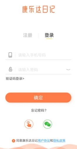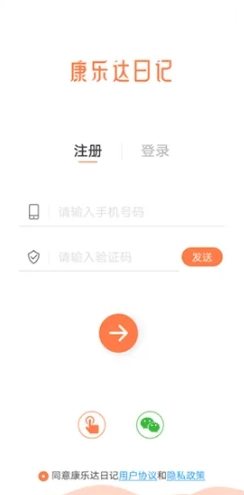 请点开“康乐达日记”,若您是首次使用,选择注册选项,然后点击页面最下方的“同意康乐达日记用户协议和隐私政策”。