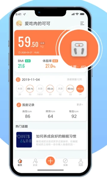 康乐达日记配合智能体脂秤使用,可即刻同步体重、脂肪率、身体水分、基础代谢率等20项身体指标,评测分析身体状态,