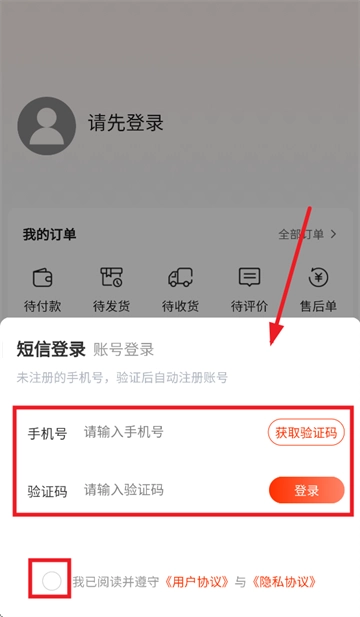 输入手机号,验证码,勾选我已阅读并遵守《用户协议》与《隐私协议》,点击登录即可,未注册的手机号,验证后自动注册账号