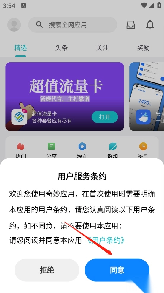 1、第一步,在本站安装奇妙应用,初次进入时需同意相关政策。