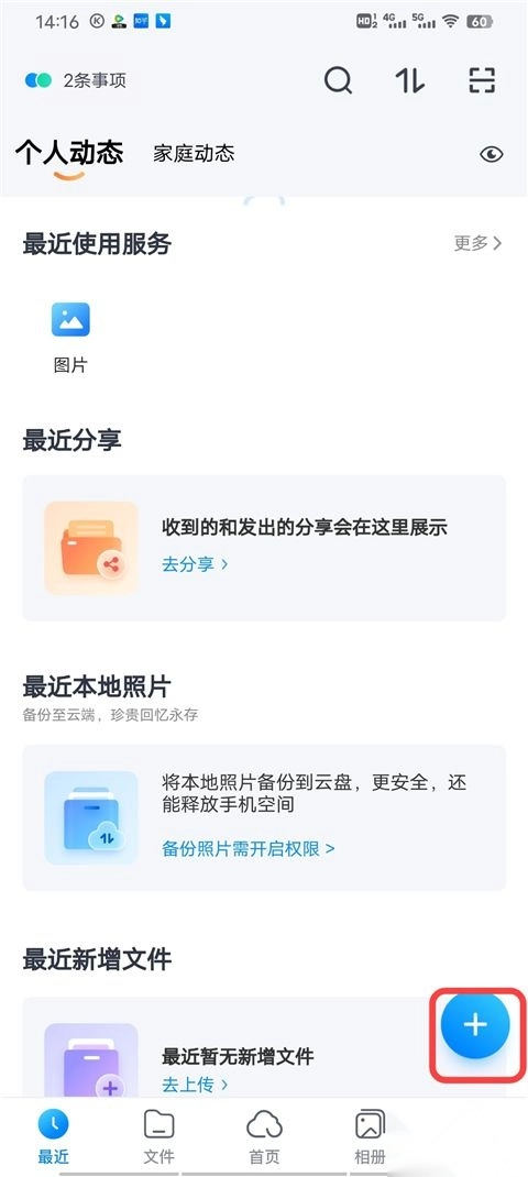 1、上传流程开启步骤:打开天翼云盘后,点击界面上的 “+” 号,即可进入文件上传操作界面。