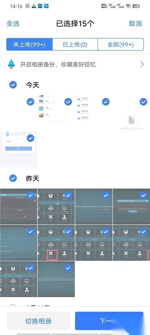 3、照片勾选方式:既能够逐张勾选,也可以通过选择“今天”“昨天”等日期,快速将对应时段的照片全部选中。