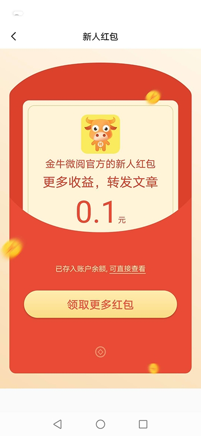 1、金牛微阅通过转发文章就能赚钱,注册后会赠送任务红包,每转发一篇文章单价是0.3元,提升积分的速度还挺快。