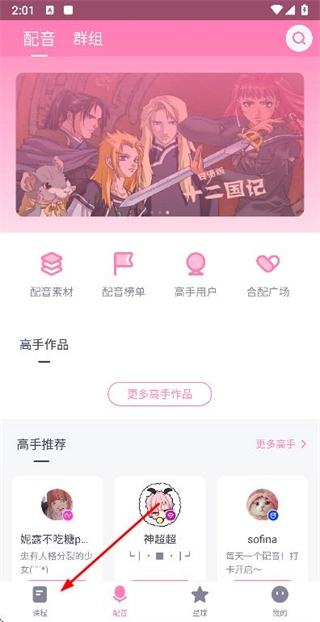 1、在配音页面点击底部的课程选项,进入课程列表页面。
