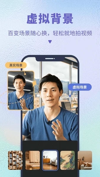 3、“背景杂乱不专业、缺少合适拍摄场地”这些问题,再也不是阻碍你观看的借口啦!借助实时铺垫功能,不用绿幕也能轻松搞定,还有海量丰富模板可供选择,让你随时随地都能开拍!