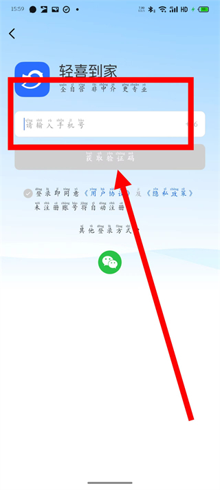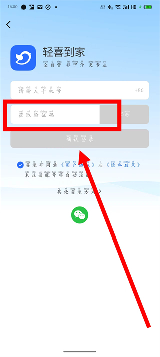 3、在登录页面,输入手机号码,点击获取验证码。