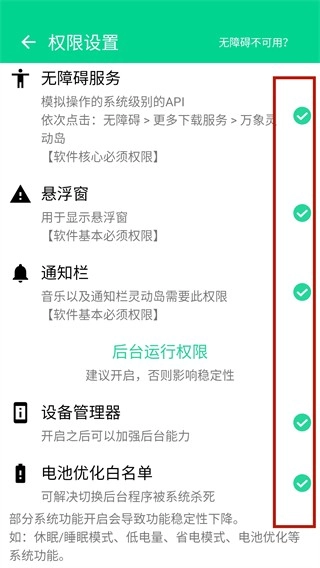 4、在使用功能前需要开启所有必要权限,请点击立即开启进入设置页面完成权限配置。