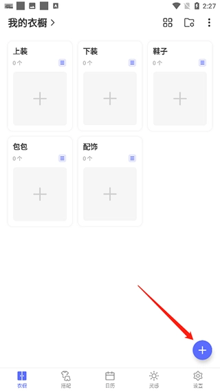 1、打开软件进入衣橱界面,点击下方加号标志