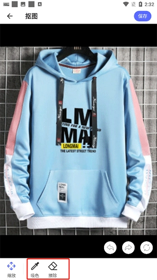 4、可使用吸色或擦除功能进行抠图,抠图完成后点击上方的保存按钮即可