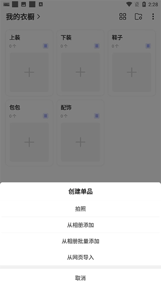 2、可以选择拍照、从相册添加或网页导入衣服图片