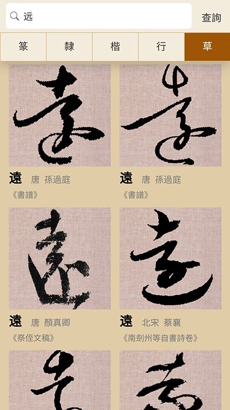 3.用户可在搜索框中输入需查询的汉字,系统会展示该字的各类书法字体及字帖,供用户挑选。