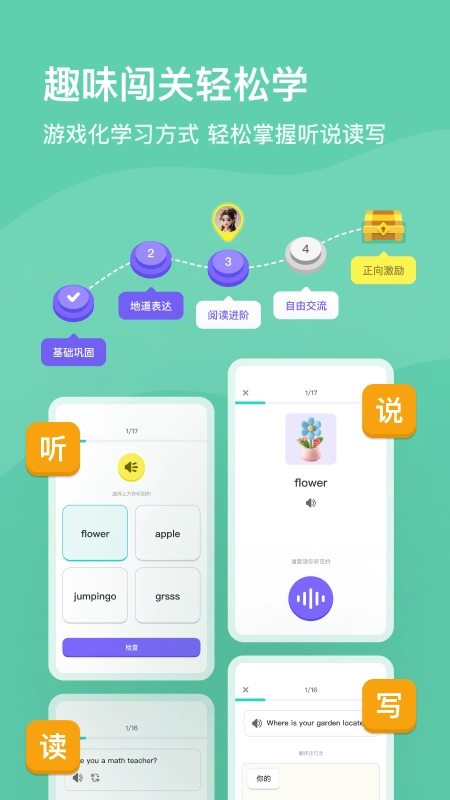 2.运用游戏化学习模式,通过趣味闯关的形式让用户轻松在线学习英语