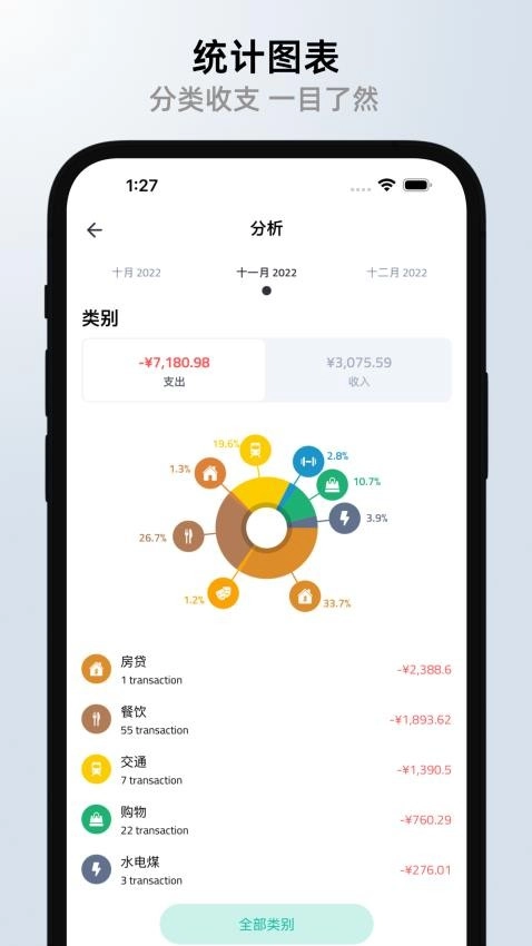 4、消费排行榜单,按月或年统计支出最多项目。用颜色与百分比标注,提醒用户注意非必要开销,优化资金分配方案。