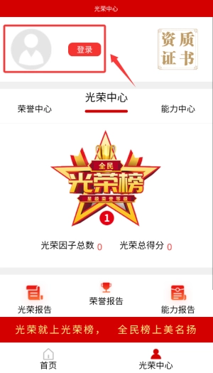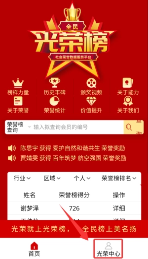 1、打开全民光荣榜后,在首页底部导航栏中找到金色"光荣中心"入口,点击即可进入个人荣誉管理页面。