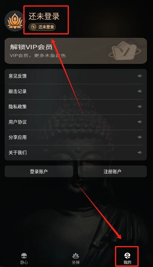 2、登录后回到主界面,轻触屏幕即可敲一次木鱼,每次敲击都会增加一点功德哦。