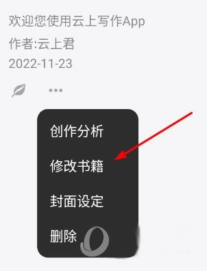 在云上写作中想要修改书名,那么你需要返回书架主页面,点击书名下方的三个点图标,在弹出来的菜单中选择【修改书籍】。