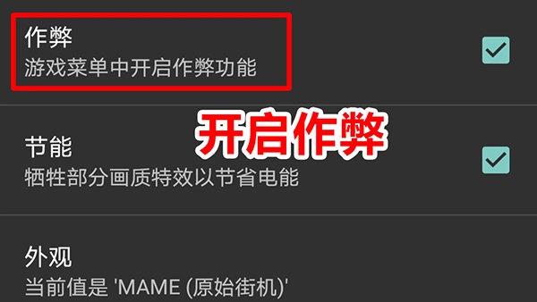 2、然后向下滑动到作弊项,勾选作弊可开启模拟器的作弊功能,下面有使用介绍。(询问重新时,选“是”)