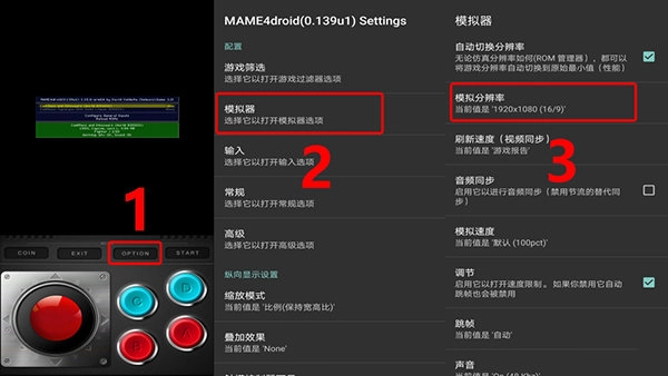 1、首先,点击屏幕右上角的OPTION按钮打开菜单栏,接着选择设置-模拟器-模拟分辨率这一选项,然后将选项滑动到最下方,推荐选择1920x1080(16/9)的分辨率。