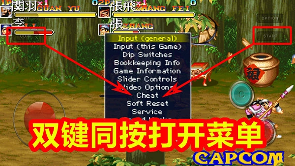 8、作弊 前面的设置开启作弊功能后,在游戏画面中,同时按模拟器画面中的START与COIN两个键,可调出系统菜单。使用摇杆上下移动到Cheat项,按B键进入。