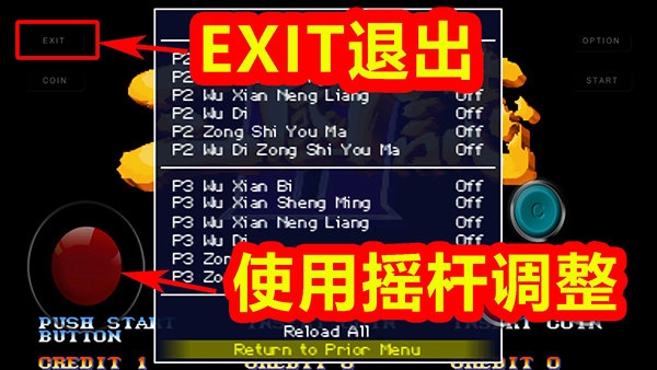 9、作弊码的英文名称已调整为拼音格式(不支持中文),可通过摇杆上下操作选择作弊项,摇杆左右控制作弊开关状态;设置完毕后,选择菜单底部的“Return to Prior Menu”选项,或点击屏幕左上角的EXIT按键,即可返回游戏界面。
