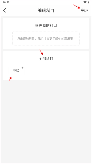 3、选好考试类型后,接下来需要选择你要练习的科目。点击科目右上角的“+”号进行添加,添加完成后,点击右上角的“完成”按钮即可。