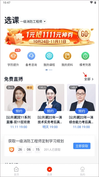 1、从首页切换到【选课】这个模块中,选择“免费直播”右边的“全部”按钮。