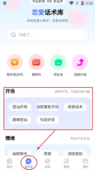 3、如需要和心仪的对象开启聊天,也可在【话术库】里点击【开场】,让你们的聊天幽默有趣不尴尬!