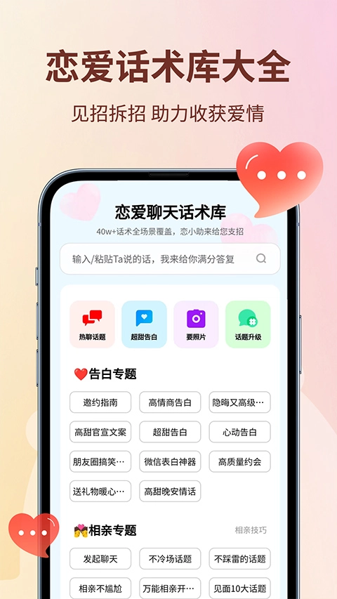 恋小助是一款专注于恋爱聊天场景的专业助手软件,丰富且完整的话术资源库,全面覆盖日常聊天的各类场景,操作便捷高效——只需一键复制对方的话语,系统便会自动搜索并生成适配的聊天话题与回复内容。此外,软件还整合了恋爱攻略、脱单技巧、真实恋爱案例、情感日记等实用功能,帮你彻底摆脱聊天时的思路卡顿与内容焦虑。其使用逻辑极为简单:复制对方消息后点击搜索,即可获取多条高情商回复方案,让你和心仪对象交流时不再陷入尴尬冷场。有需要提升恋爱聊天能力的小伙伴,不妨试试这款实用工具!