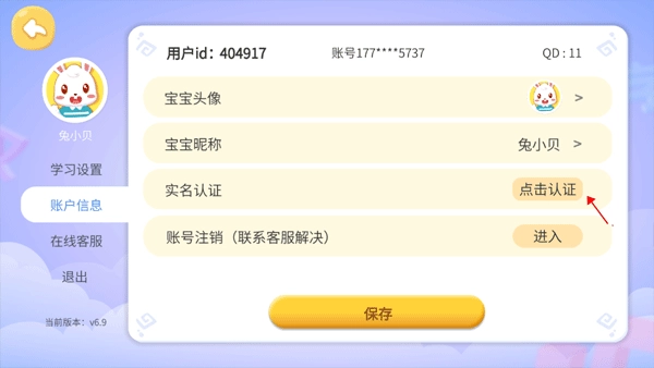 3、默认为学习设置界面,往下点击账户信息,选择右边实名认证的“点击认证”。