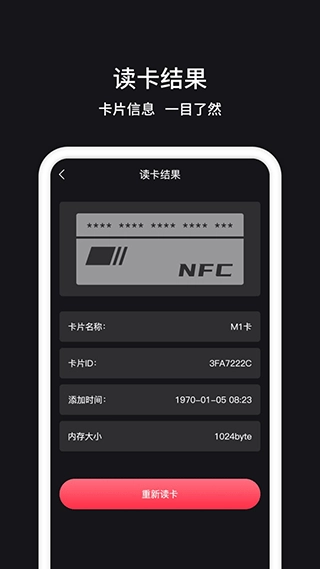 nfc门禁卡管家是一款免费的NFC卡包软件,支持借记卡、公交卡、门禁卡等各类IC卡的读取、写入与格式化操作。该软件操作便捷,只要您的手机具备NFC功能,就能轻松保存多种NFC卡,自由选择各类服务,日后回家开门、乘坐公交直接刷手机即可,十分便利。有需要的朋友快来体验吧!