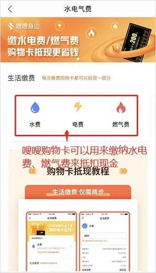 3、激活成功后,回到主页,“嗖嗖购物卡”可用于手机费充值抵现金、水电费及燃气费缴纳抵现金,打开“水电气费”功能即可使用。