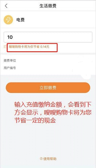 6、进入缴费页面后,输入金额时,您会留意到金额下方出现一行红色小字,这行字会提示您嗖嗖购物卡能为您节省的具体现金数额。