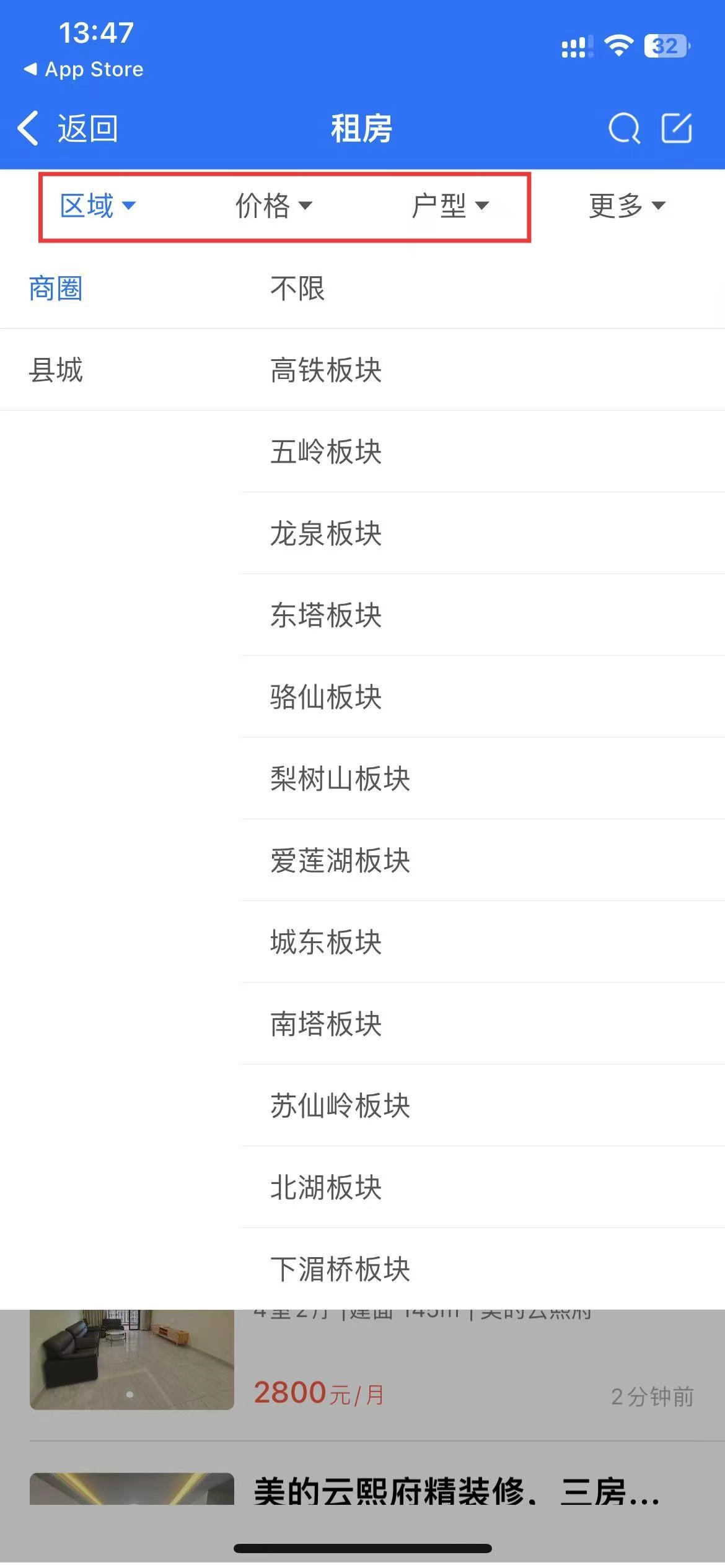 在租房页面,设置【区域】【价格】【户型】等筛选条件。