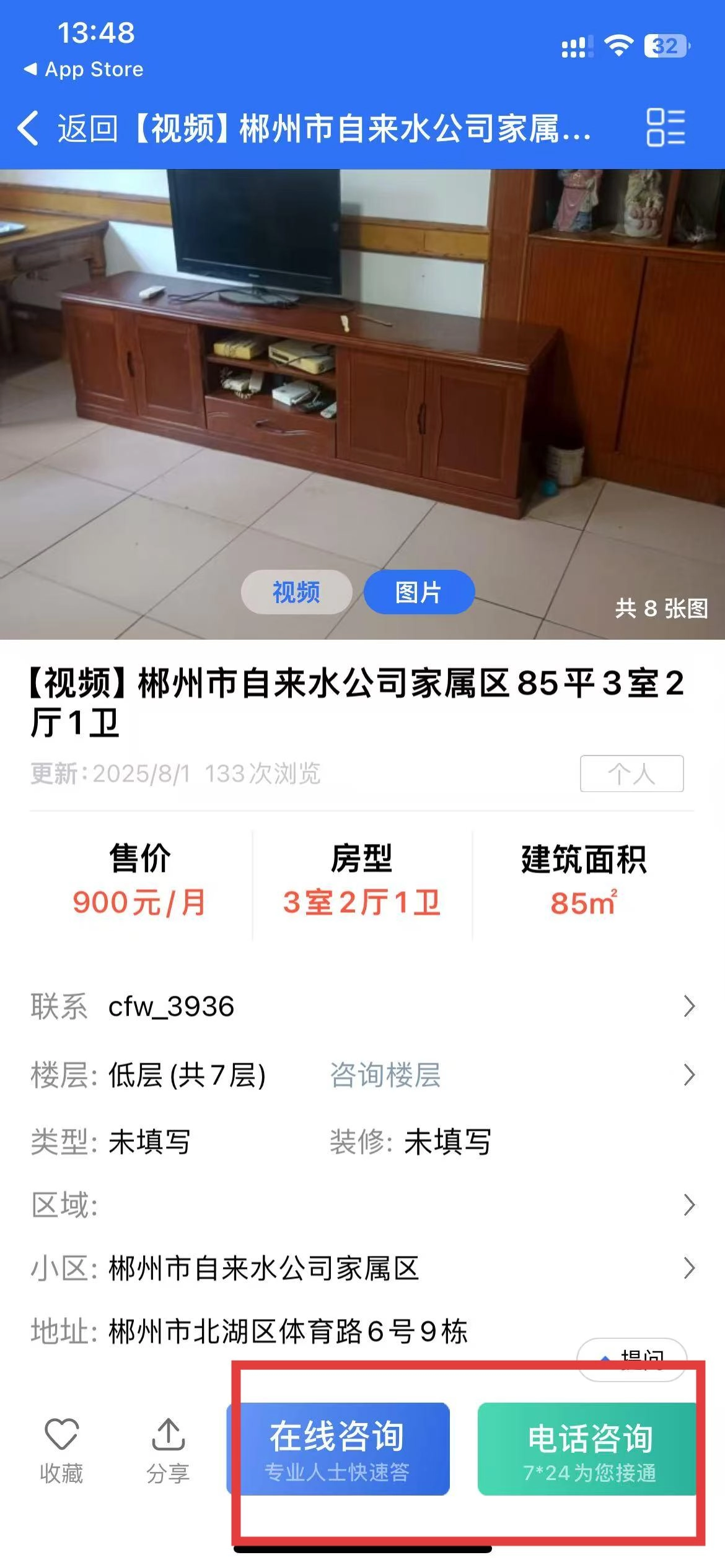 4、在房源详情页面,点击【在线咨询】或【电话咨询】按钮,即可进行联系咨询。