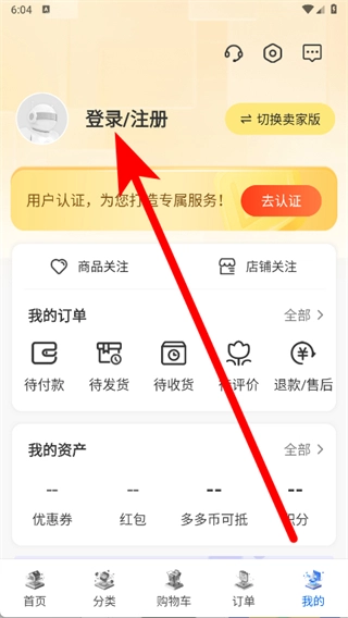 3、在我的页面,点击登录注册按钮。