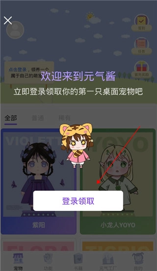 1、首先元气酱软件并打开,进入主页后选择登录账号,成功登录后,开机即会赠送一只小宠物。