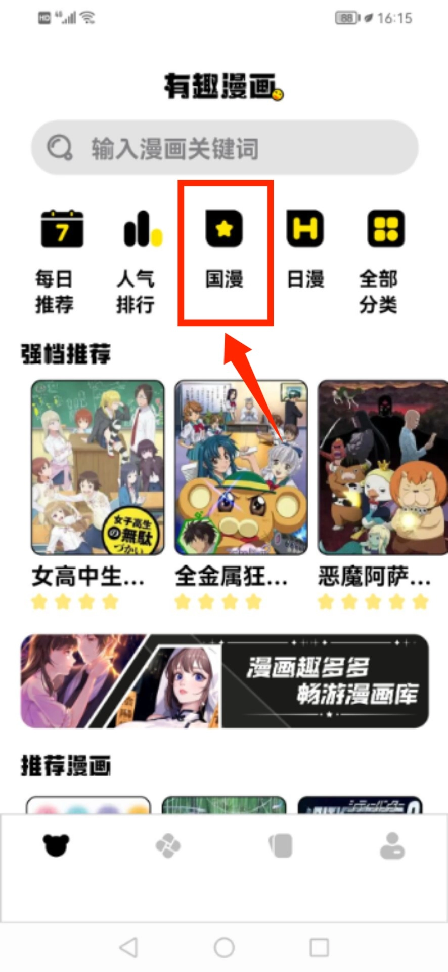应用启动后,在主页的导航栏里找到“国漫”专区的入口,点击该入口就能进入对应的分类页面。
